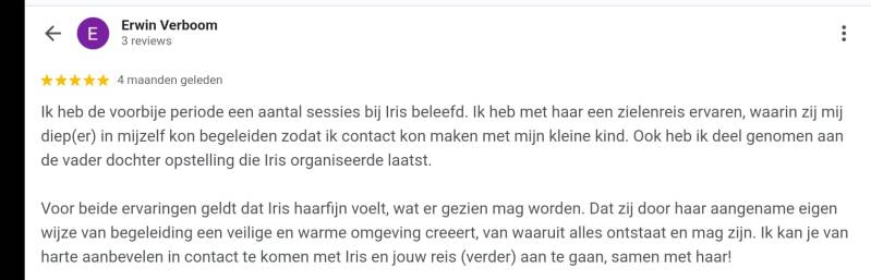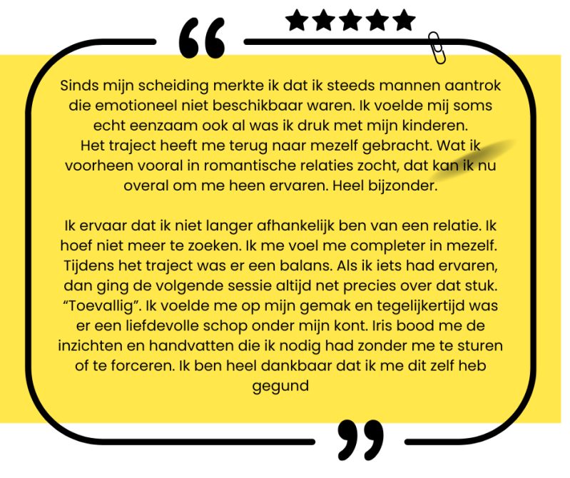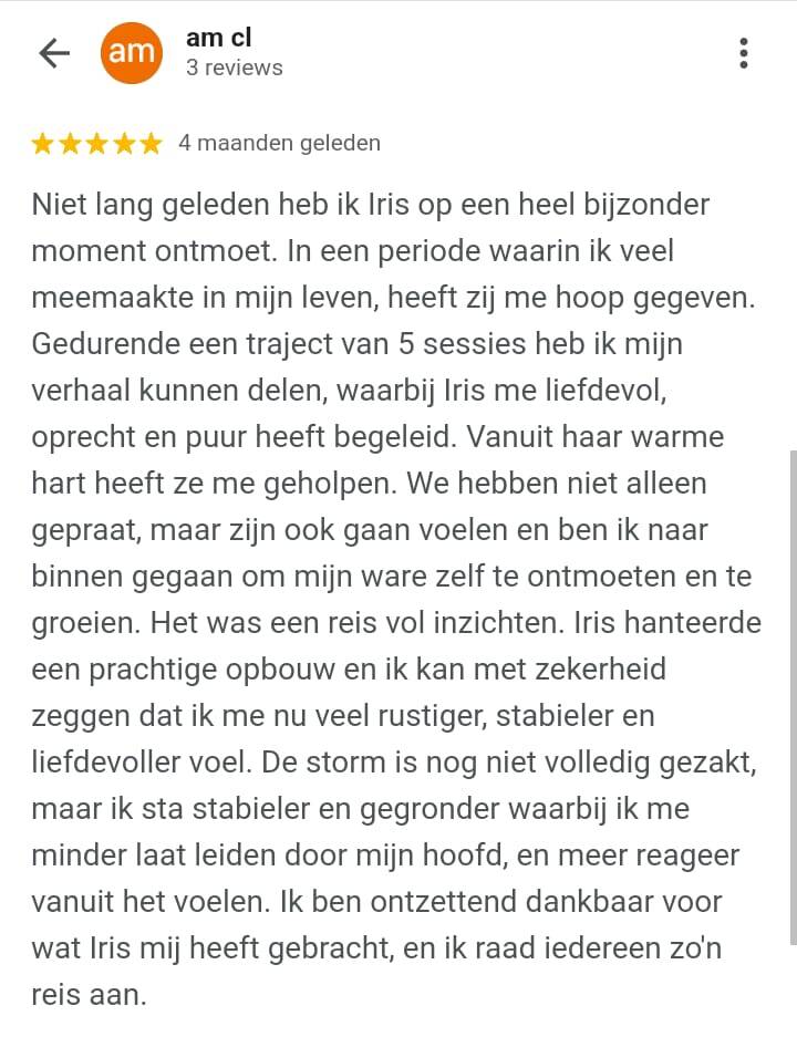 Tijdens het traject zijn er diepe dingen aangeraakt waardoor er nieuwe ruimte is ontstaan en ik mij gedragen en begrepen voel.."